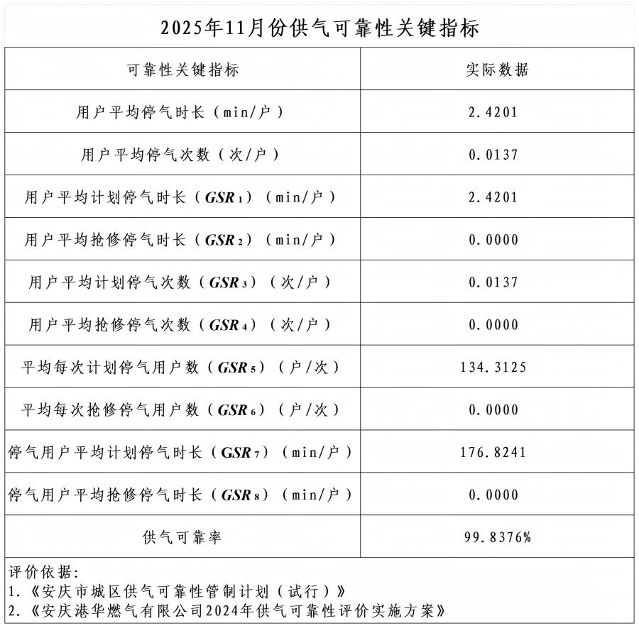 2025年11月份供氣可靠性關(guān)鍵指標(biāo)