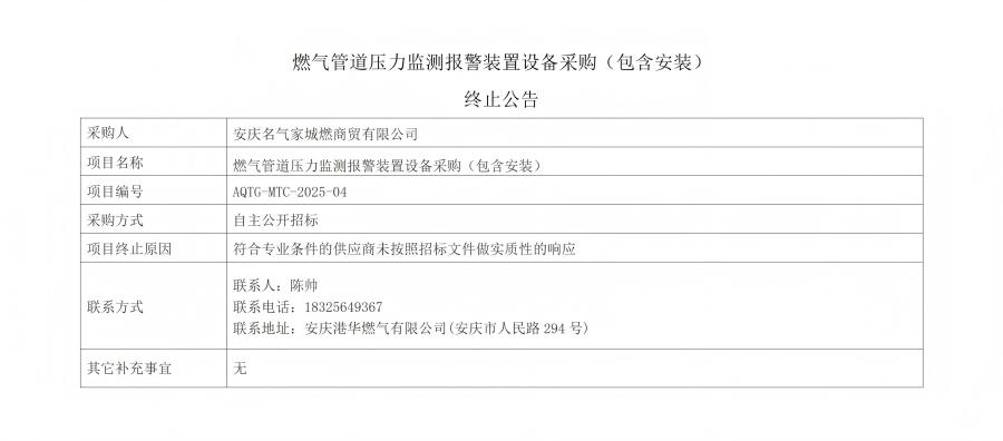 燃氣管道壓力監(jiān)測報警裝置設備采購(包含安裝)終止公告